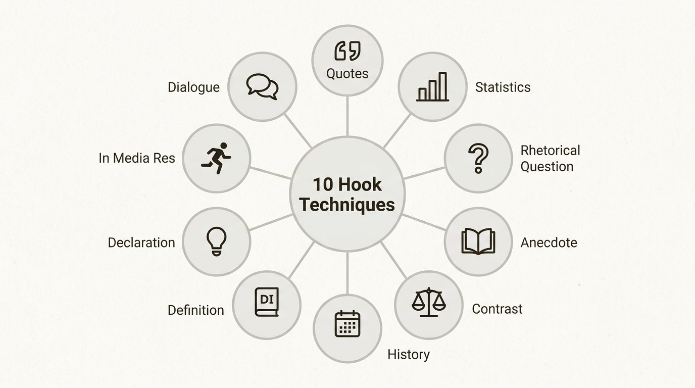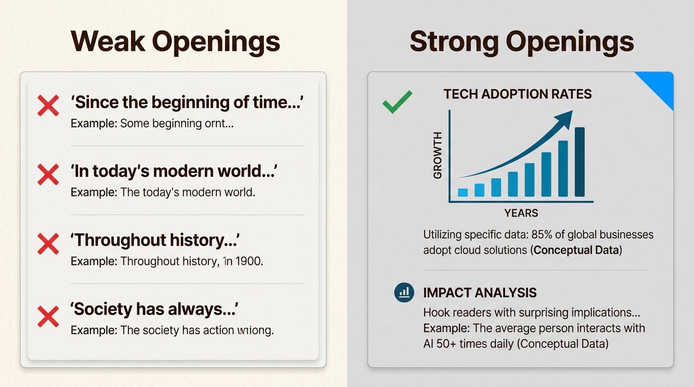 Accuracy matters: Historical references must be accurate. If you're unsure of a date or detail, either verify it or choose a different opening technique. A historical error in your first sentence creates a poor impression, according to Wizeprep, which emphasizes precision in opening sentences.