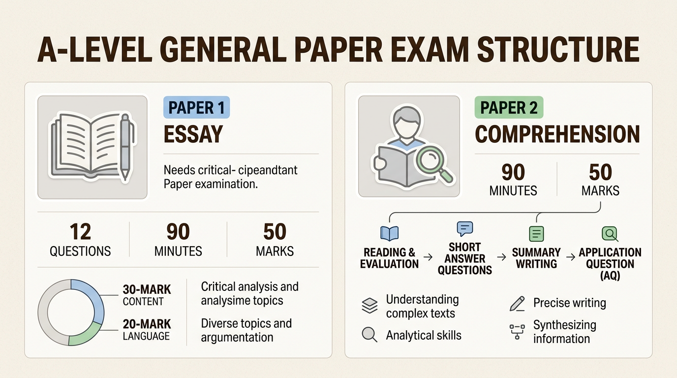 The A-Level General Paper exam is divided into Paper 1 (Essay) and Paper 2 (Comprehension), each carrying 50% of your grade. Paper 1 gives you 12 questions covering everything from science and technology to arts and politics. You pick one. You have 90 minutes. Thirty marks go to content and argumentation, while 20 marks (that's 40%) are awarded for your use of English.