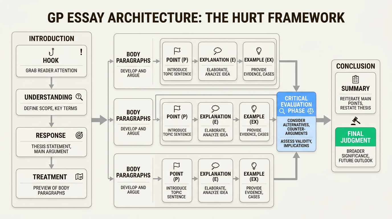 A well-structured essay guides the examiner through your thinking. Poor structure buries good ideas in confusion. The HURT framework, popularized by LX English, provides a reliable introduction structure: