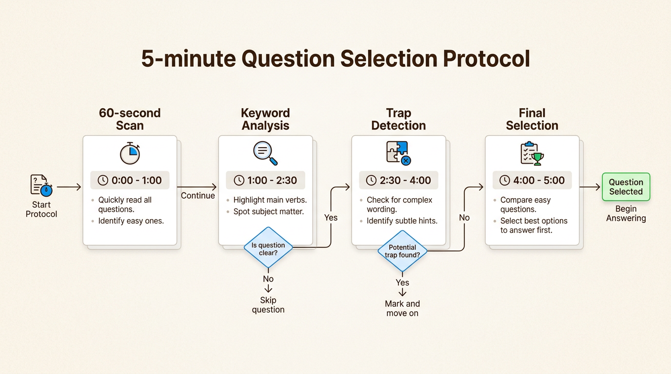The worst thing you can do is panic and grab the first question that looks vaguely familiar. Stick to the protocol. Spend the full five minutes. A rushed choice made in 30 seconds of anxiety will cost you far more than the four and a half minutes you "save."