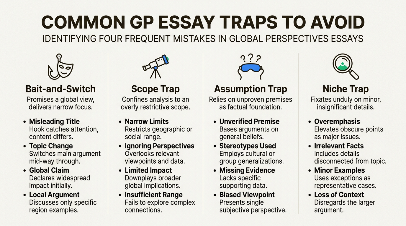 Understanding traps in theory helps. Seeing them in practice helps more. Here are the most common trap types with examples of how they appear. For a broader overview of pitfalls that cost marks, see our guide on common A-Level essay mistakes.