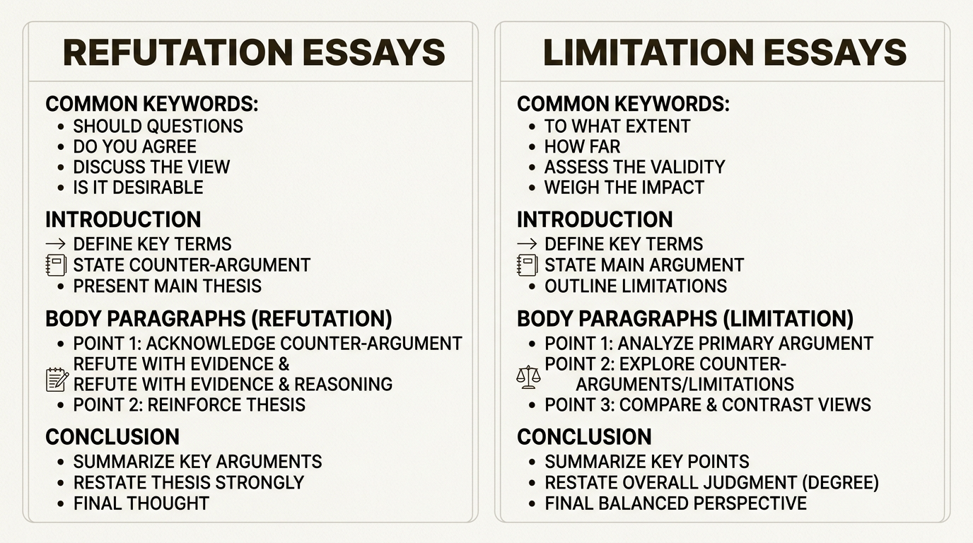 For example, some students spend precious exam time debating whether a question is "refutation" or "limitation" rather than simply answering it. The result is essays that follow formulas but lack substance. Cambridge examiners consistently emphasize that they value genuine understanding and critical thinking over rigid structures — a pattern echoed across boards in what examiners wish students knew.