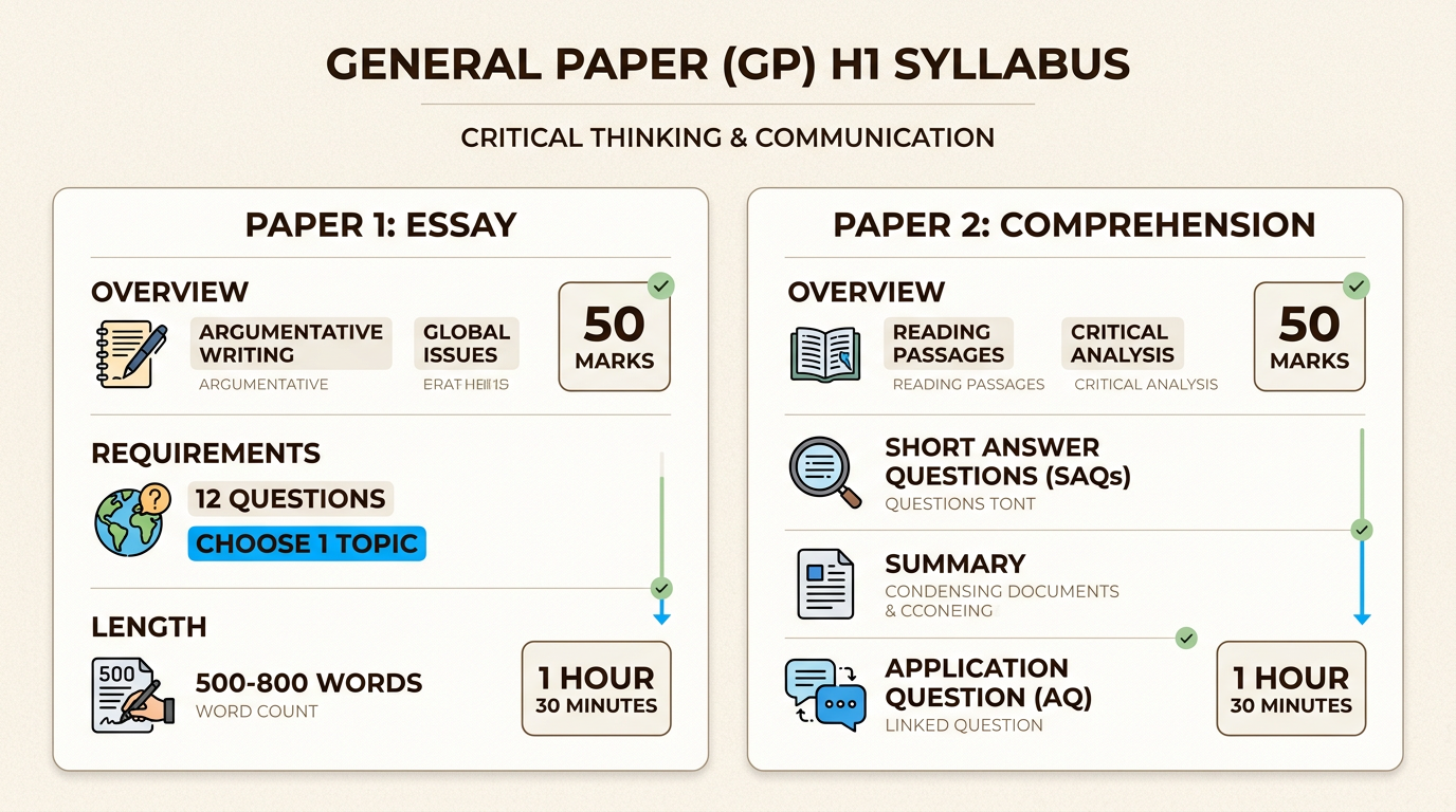 General Paper is a compulsory H1 subject for A-Levels that tests far more than English proficiency. The exam has two papers: