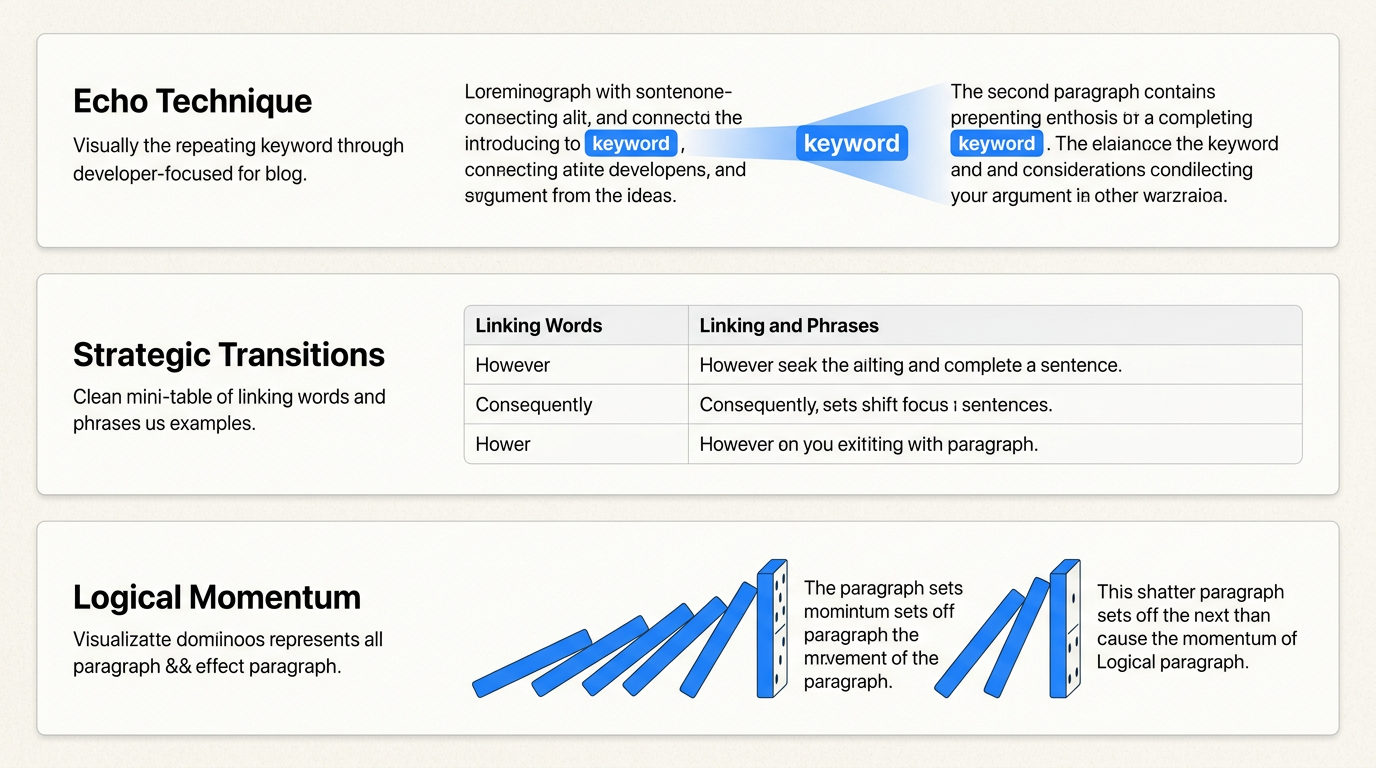 The echo technique is the simplest linking strategy, but when done well, it is remarkably effective. The idea, also known as echo words in academic writing, is to deliberately repeat the most important word or concept from the end of one paragraph at the beginning of the next. You are creating a bridge using the language itself.