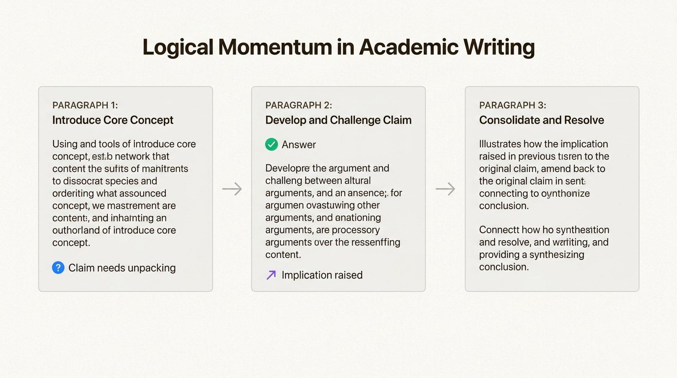 Think of it like setting up dominoes. Your concluding sentence creates an expectation, raises an implication, or poses an implicit question that the next paragraph will address. The reader finishes one paragraph already anticipating what they need to know next. Academic writing expert Pat Thomson explains that this technique creates "forward momentum" that pulls readers through your argument.